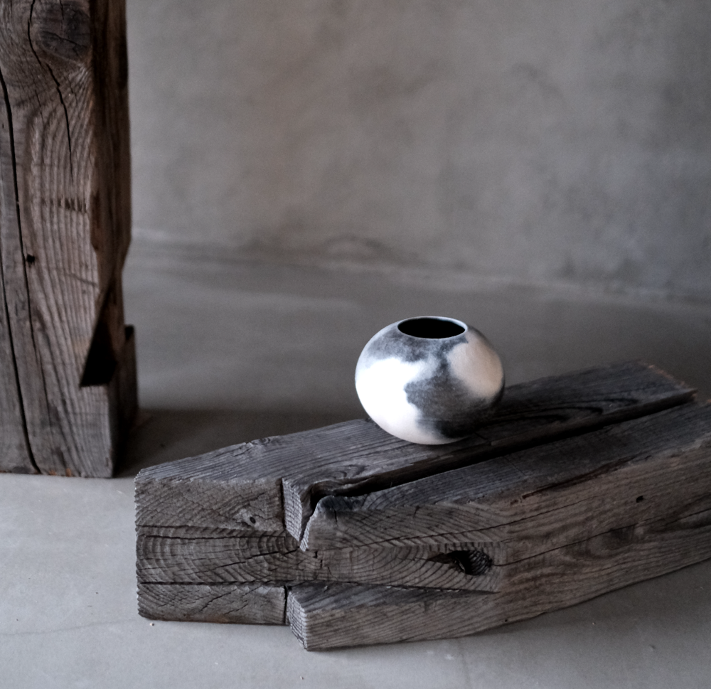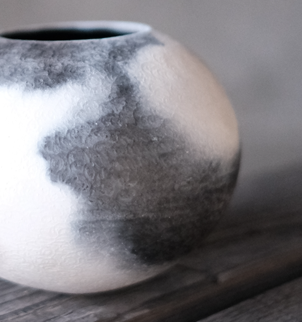 톱밥, 나무 부스러기, 커피 찌꺼기, 마른 잎, 꽃과 같은 엄선된 유기 재료 모음으로 훈제 소성되어 표면의 패턴을 완성합니다.